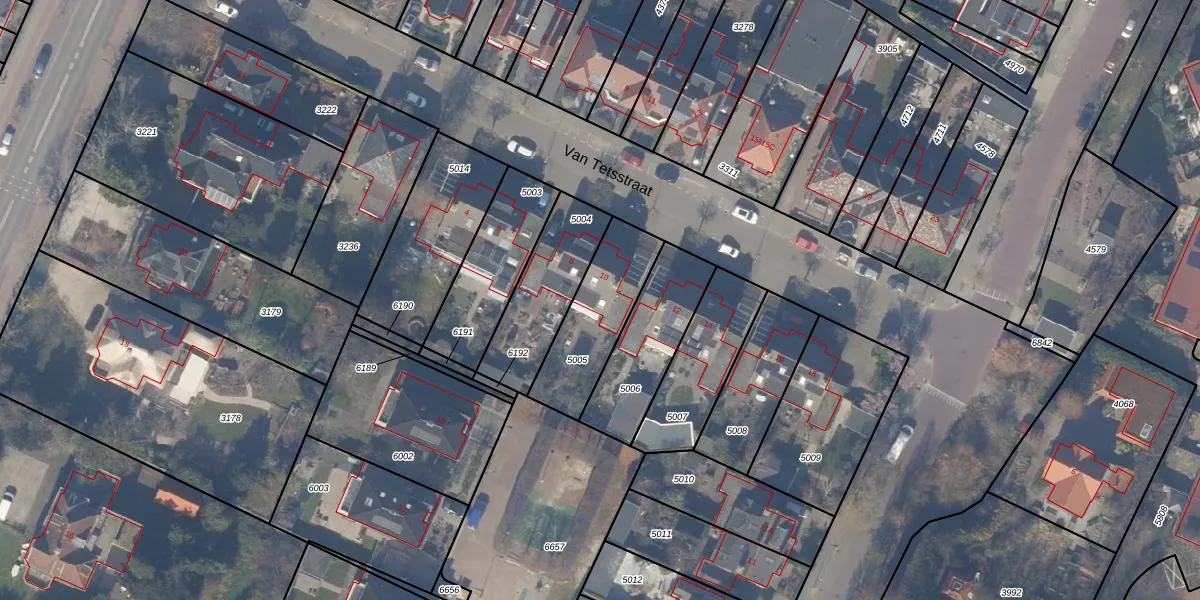 Het perceel waarop Van Tetsstraat 10 staat heeft een oppervlakte van 318 m². Dit is een groot perceel. De perceeloppervlakte wordt geregistreerd door het Kadaster. Gedetailleerde informatie over de maten van dit perceel kunt u vinden in het rapport Kadastrale kaart met maatvoering van Van Tetsstraat 10.
