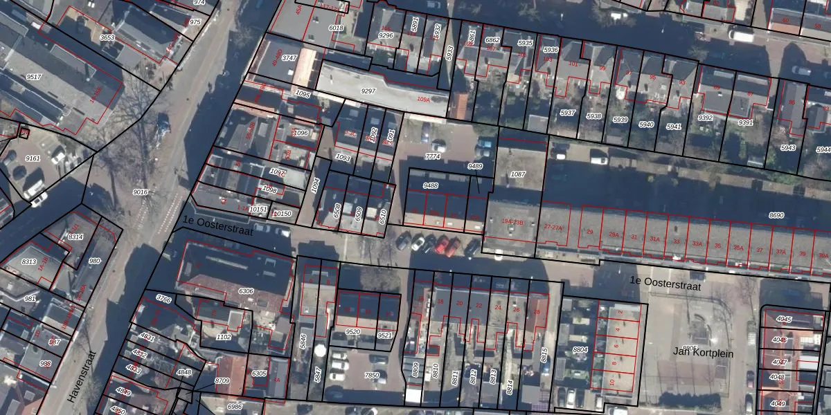 1e Oosterstraat 15 is gelegen op kadastraal perceel HVS00N9488. Deze kadastrale aanduiding is uniek en wordt gebruikt door het Kadaster om eigendomsrechten en andere zakelijke rechten vast te leggen. Het perceel maakt onderdeel uit van de kadastrale gemeente Hilversum.