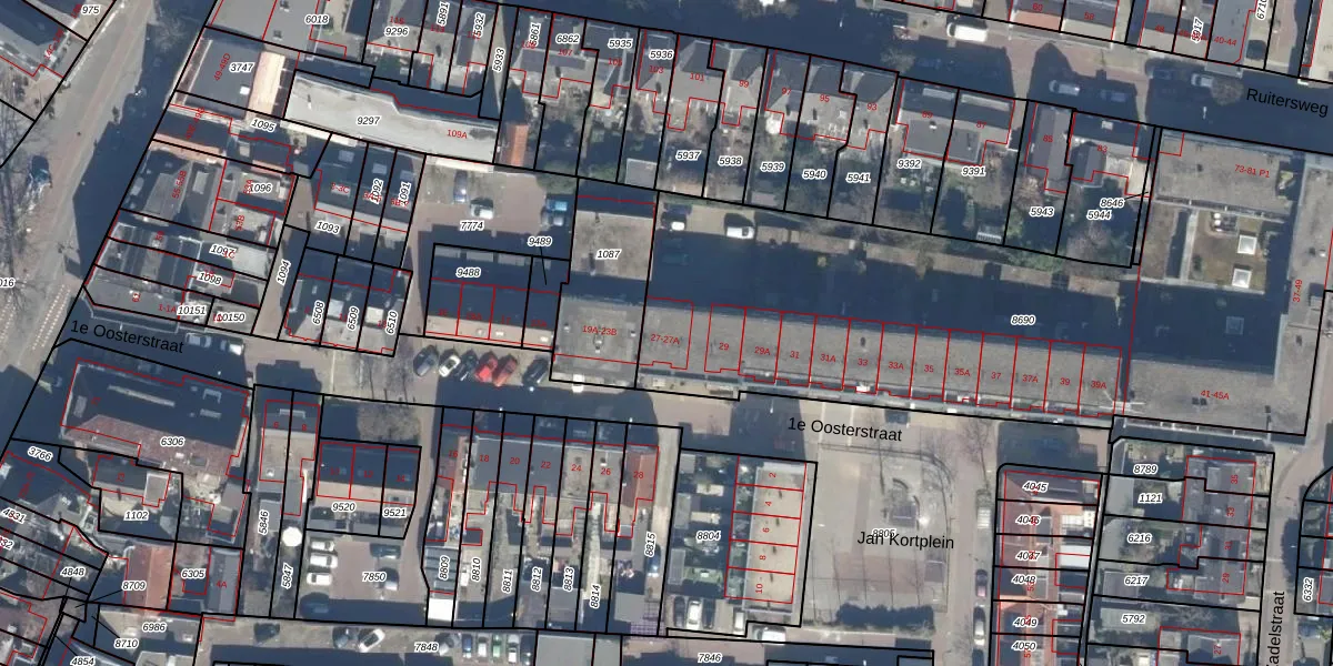 Het perceel waarop 1e Oosterstraat 27-A staat heeft een oppervlakte van 3199 m². Dit is een zeer groot perceel. De perceeloppervlakte wordt geregistreerd door het Kadaster. Gedetailleerde informatie over de maten van dit perceel kunt u vinden in het rapport Kadastrale kaart met maatvoering van 1e Oosterstraat 27-A.