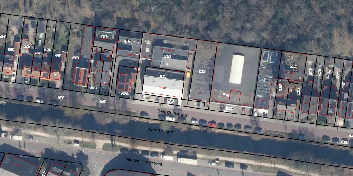 Beresteinseweg 54 is gelegen op kadastraal perceel HVS00I2893. Deze kadastrale aanduiding is uniek en wordt gebruikt door het Kadaster om eigendomsrechten en andere zakelijke rechten vast te leggen. Het perceel maakt onderdeel uit van de kadastrale gemeente Hilversum.