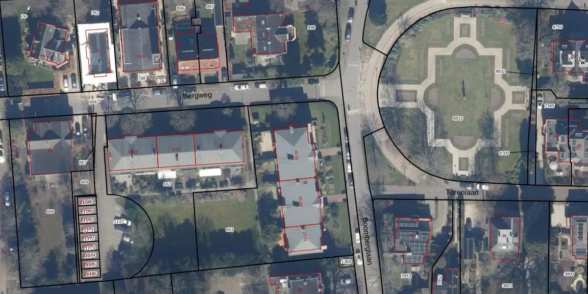 Het perceel waarop Boomberglaan 49 staat heeft een oppervlakte van 2186 m². Dit is een zeer groot perceel. De perceeloppervlakte wordt geregistreerd door het Kadaster. Gedetailleerde informatie over de maten van dit perceel kunt u vinden in het rapport Kadastrale kaart met maatvoering van Boomberglaan 49.