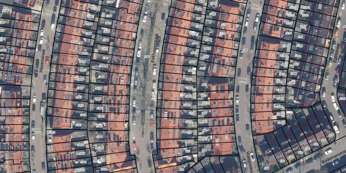 Het perceel waarop Eekhoornstraat 22 staat heeft een oppervlakte van 108 m². Dit is een middelgroot perceel. De perceeloppervlakte wordt geregistreerd door het Kadaster. Gedetailleerde informatie over de maten van dit perceel kunt u vinden in het rapport Kadastrale kaart met maatvoering van Eekhoornstraat 22.