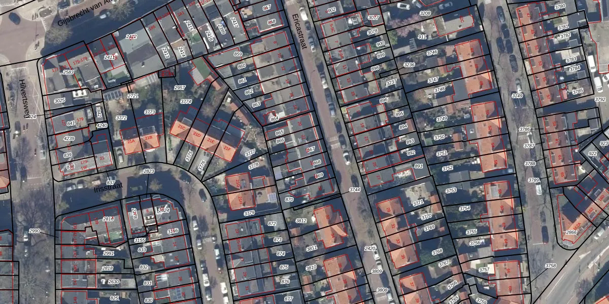Ericastraat 24 is gelegen op kadastraal perceel HVS00L867. Deze kadastrale aanduiding is uniek en wordt gebruikt door het Kadaster om eigendomsrechten en andere zakelijke rechten vast te leggen. Het perceel maakt onderdeel uit van de kadastrale gemeente Hilversum.