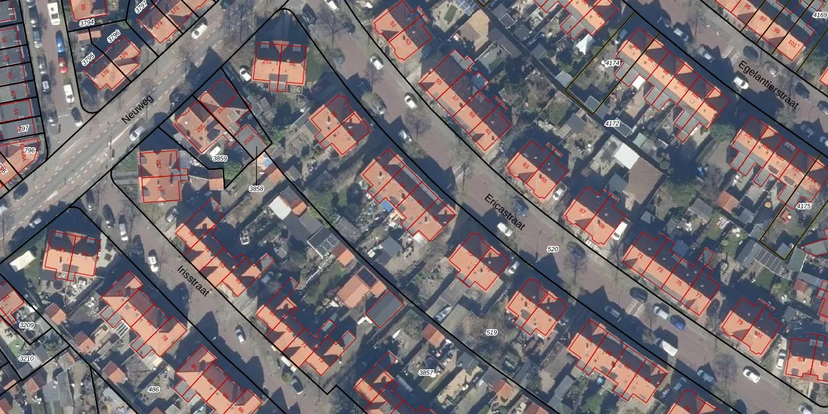 Het perceel waarop Ericastraat 66 staat heeft een oppervlakte van 4210 m². Dit is een zeer groot perceel. De perceeloppervlakte wordt geregistreerd door het Kadaster. Gedetailleerde informatie over de maten van dit perceel kunt u vinden in het rapport Kadastrale kaart met maatvoering van Ericastraat 66.