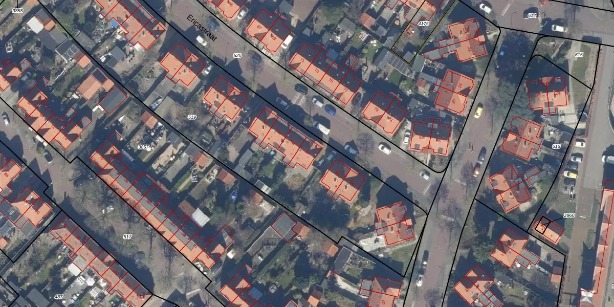 Ericastraat 84 is gelegen op kadastraal perceel HVS00L519. Deze kadastrale aanduiding is uniek en wordt gebruikt door het Kadaster om eigendomsrechten en andere zakelijke rechten vast te leggen. Het perceel maakt onderdeel uit van de kadastrale gemeente Hilversum.