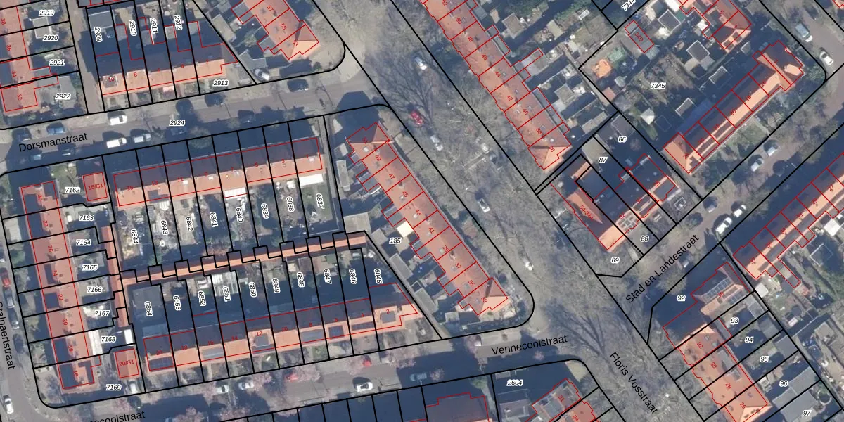 Het perceel waarop Floris Vosstraat 43 staat heeft een oppervlakte van 1385 m². Dit is een zeer groot perceel. De perceeloppervlakte wordt geregistreerd door het Kadaster. Gedetailleerde informatie over de maten van dit perceel kunt u vinden in het rapport Kadastrale kaart met maatvoering van Floris Vosstraat 43.