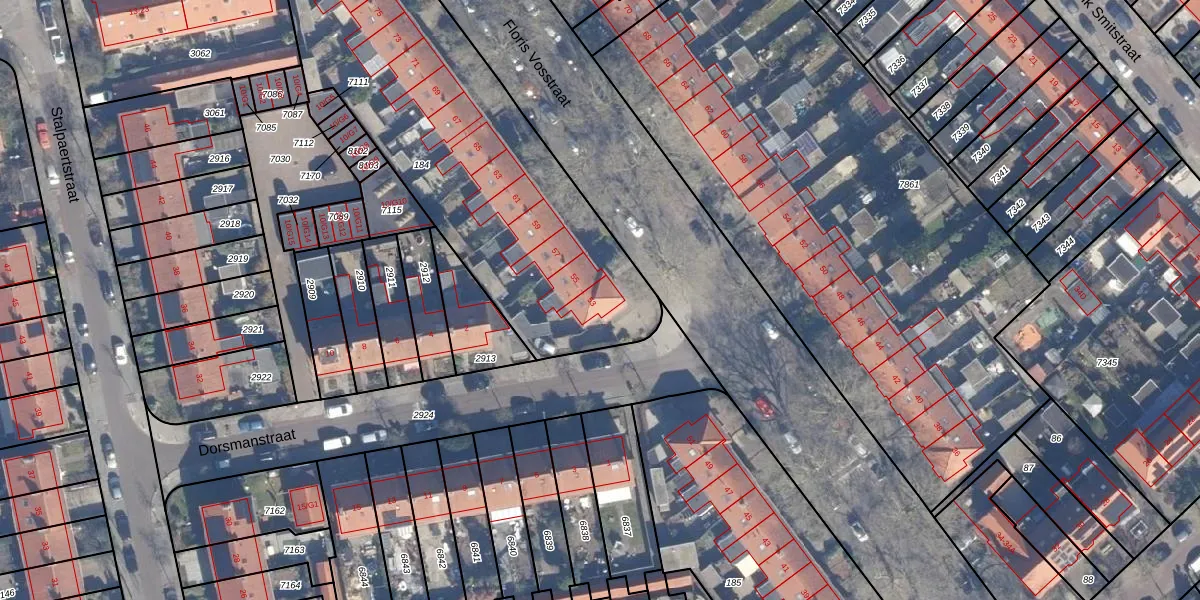 Het perceel waarop Floris Vosstraat 53 staat heeft een oppervlakte van 1965 m². Dit is een zeer groot perceel. De perceeloppervlakte wordt geregistreerd door het Kadaster. Gedetailleerde informatie over de maten van dit perceel kunt u vinden in het rapport Kadastrale kaart met maatvoering van Floris Vosstraat 53.