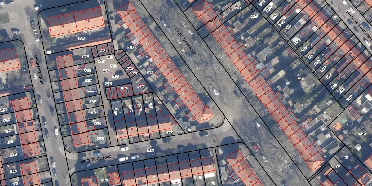 Het perceel waarop Floris Vosstraat 59 staat heeft een oppervlakte van 1965 m². Dit is een zeer groot perceel. De perceeloppervlakte wordt geregistreerd door het Kadaster. Gedetailleerde informatie over de maten van dit perceel kunt u vinden in het rapport Kadastrale kaart met maatvoering van Floris Vosstraat 59.