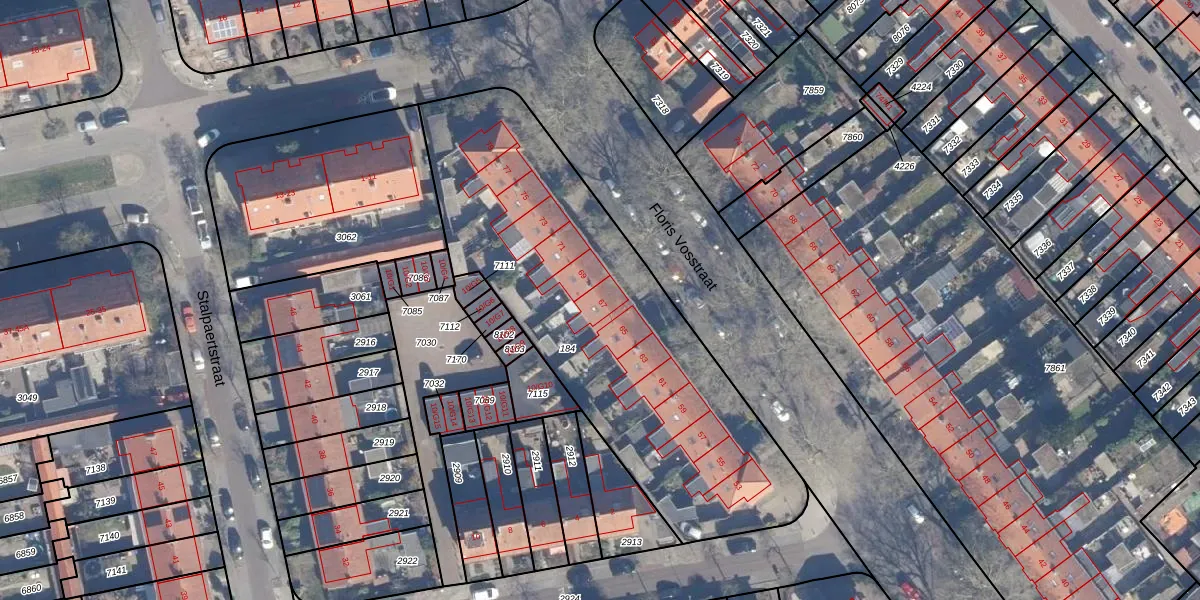 Het perceel waarop Floris Vosstraat 67 staat heeft een oppervlakte van 1965 m². Dit is een zeer groot perceel. De perceeloppervlakte wordt geregistreerd door het Kadaster. Gedetailleerde informatie over de maten van dit perceel kunt u vinden in het rapport Kadastrale kaart met maatvoering van Floris Vosstraat 67.