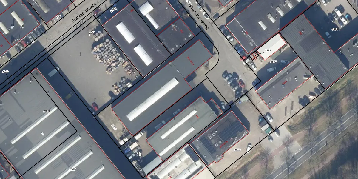 Het perceel waarop Franciscusweg 351-A staat heeft een oppervlakte van 1672 m². Dit is een zeer groot perceel. De perceeloppervlakte wordt geregistreerd door het Kadaster. Gedetailleerde informatie over de maten van dit perceel kunt u vinden in het rapport Kadastrale kaart met maatvoering van Franciscusweg 351-A.