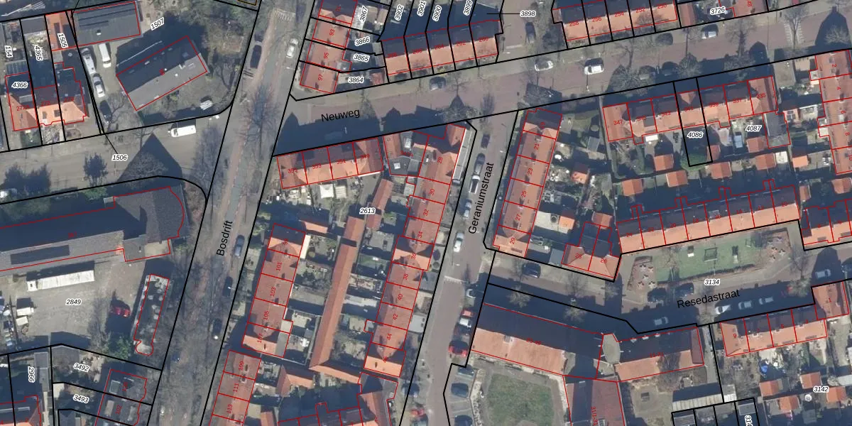 Het perceel waarop Geraniumstraat 32 staat heeft een oppervlakte van 3548 m². Dit is een zeer groot perceel. De perceeloppervlakte wordt geregistreerd door het Kadaster. Gedetailleerde informatie over de maten van dit perceel kunt u vinden in het rapport Kadastrale kaart met maatvoering van Geraniumstraat 32.
