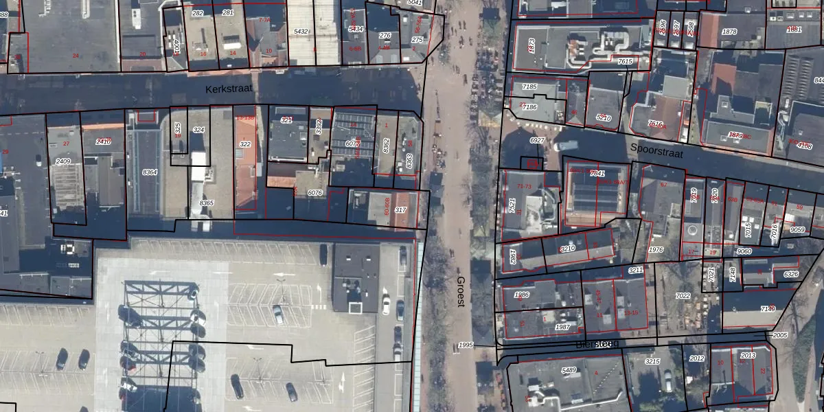 Het perceel waarop Groest 60 staat heeft een oppervlakte van 181 m². Dit is een middelgroot perceel. De perceeloppervlakte wordt geregistreerd door het Kadaster. Gedetailleerde informatie over de maten van dit perceel kunt u vinden in het rapport Kadastrale kaart met maatvoering van Groest 60.
