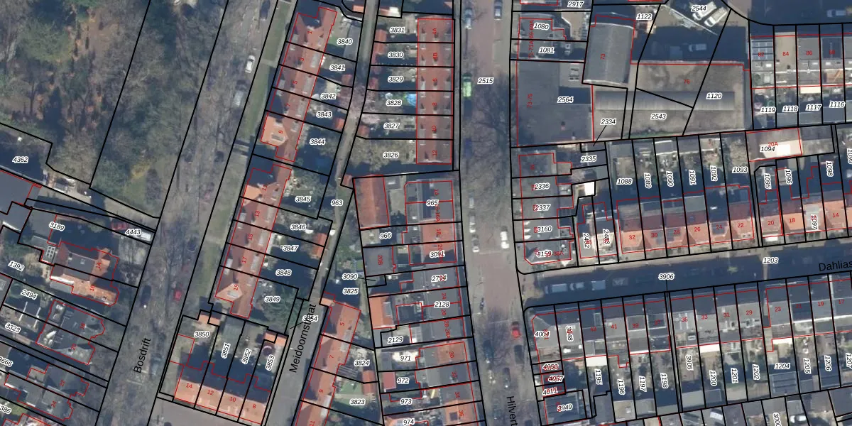 Het perceel waarop het adres ligt is HVS00-L-965. De afkorting 'HVS00' staat voor kadastrale gemeente Hilversum. Het perceel is kleiner dan gemiddeld in Hilversum. Het perceel is 289 m² groot, terwijl het gemiddelde ligt op 1394,51 m². Het grootste perceel in de kadastrale gemeente is 91,7 ha. Het kleinste perceel heeft een oppervlakte van 0 m². Er zijn 3 adressen aanwezig op het perceel. De huidige grenzen van het perceel zijn digitaal in de Basisregistratie Kadaster (BRK) geregistreerd op 30-12-2011.