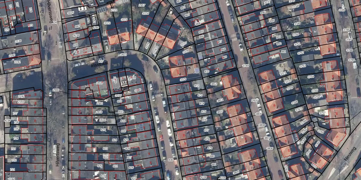 Irisstraat 23 is gelegen op kadastraal perceel HVS00L872. Deze kadastrale aanduiding is uniek en wordt gebruikt door het Kadaster om eigendomsrechten en andere zakelijke rechten vast te leggen. Het perceel maakt onderdeel uit van de kadastrale gemeente Hilversum.