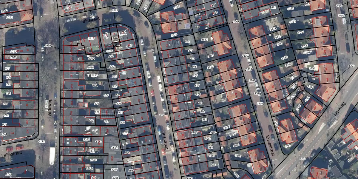 Irisstraat 33 is gelegen op kadastraal perceel HVS00L877. Deze kadastrale aanduiding is uniek en wordt gebruikt door het Kadaster om eigendomsrechten en andere zakelijke rechten vast te leggen. Het perceel maakt onderdeel uit van de kadastrale gemeente Hilversum.