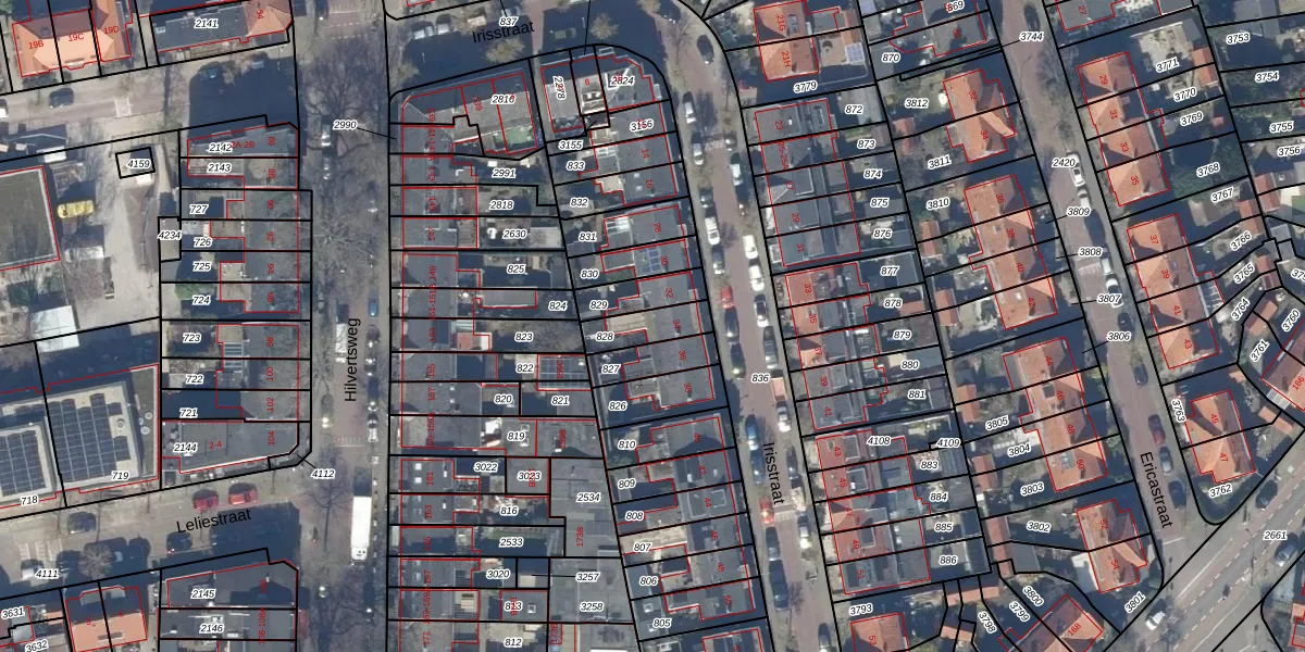 Irisstraat 34 is gelegen op kadastraal perceel HVS00L828. Deze kadastrale aanduiding is uniek en wordt gebruikt door het Kadaster om eigendomsrechten en andere zakelijke rechten vast te leggen. Het perceel maakt onderdeel uit van de kadastrale gemeente Hilversum.