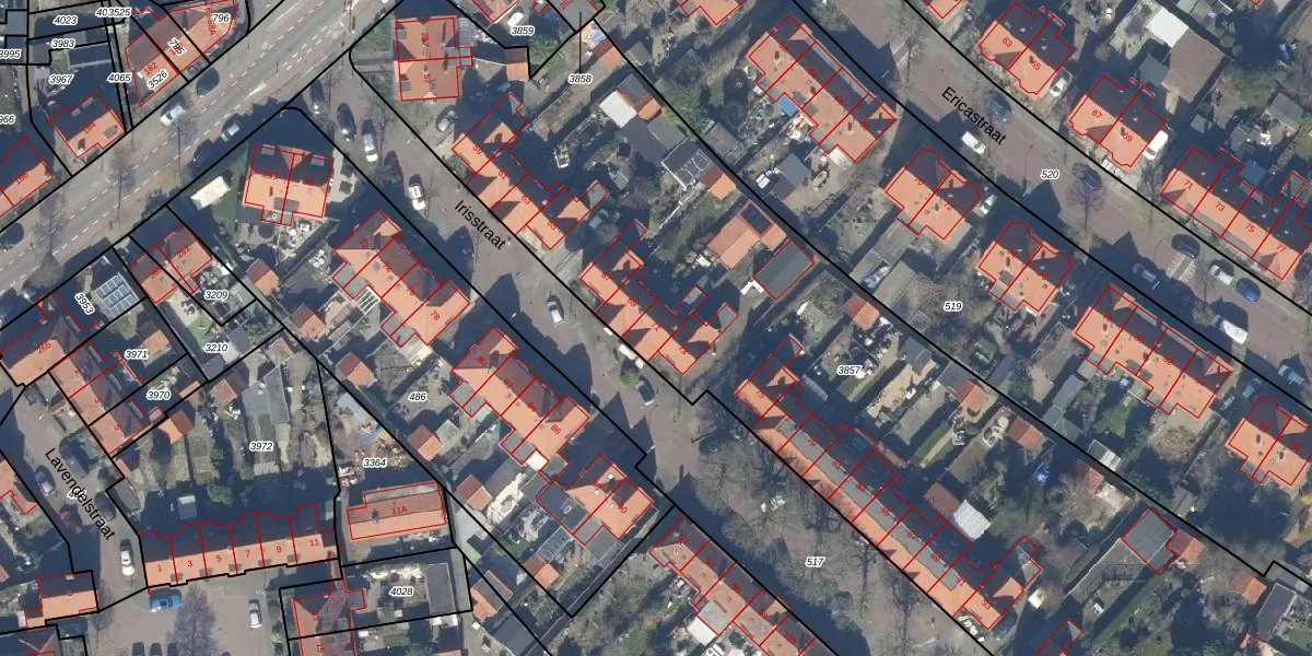 Het perceel waarop Irisstraat 71 staat heeft een oppervlakte van 6475 m². Dit is een zeer groot perceel. De perceeloppervlakte wordt geregistreerd door het Kadaster. Gedetailleerde informatie over de maten van dit perceel kunt u vinden in het rapport Kadastrale kaart met maatvoering van Irisstraat 71.