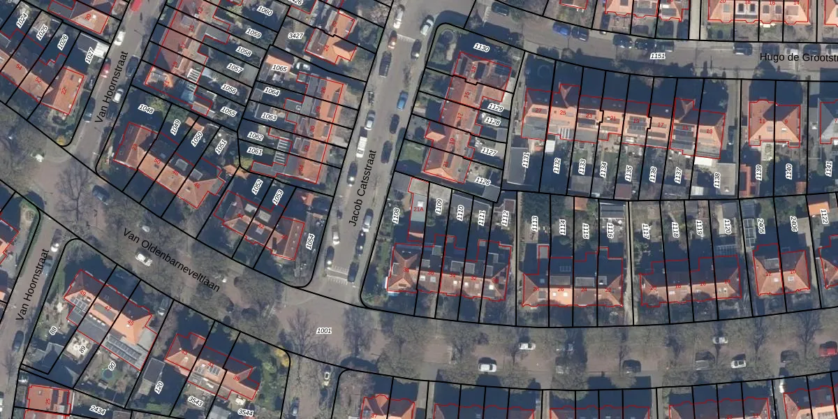 Het perceel waarop Jacob Catsstraat 21-A staat heeft een oppervlakte van 370 m². Dit is een groot perceel. De perceeloppervlakte wordt geregistreerd door het Kadaster. Gedetailleerde informatie over de maten van dit perceel kunt u vinden in het rapport Kadastrale kaart met maatvoering van Jacob Catsstraat 21-A.