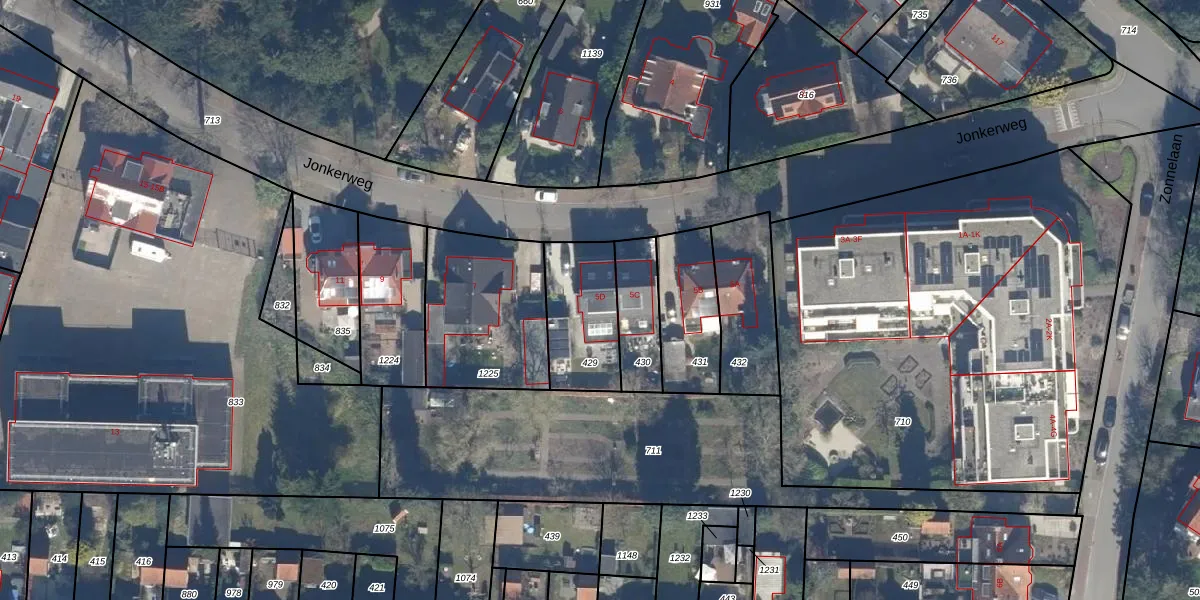 Het perceel waarop Jonkerweg 5-D staat heeft een oppervlakte van 308 m². Dit is een groot perceel. De perceeloppervlakte wordt geregistreerd door het Kadaster. Gedetailleerde informatie over de maten van dit perceel kunt u vinden in het rapport Kadastrale kaart met maatvoering van Jonkerweg 5-D.