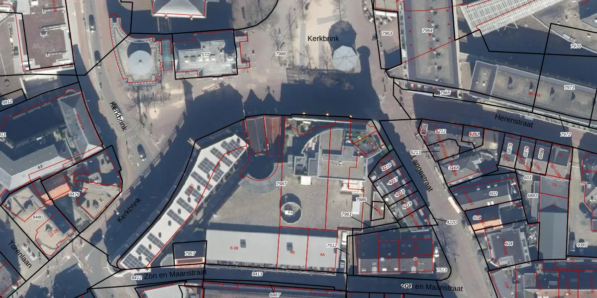 Kerkbrink 9 is gelegen op kadastraal perceel HVS00N7987. Deze kadastrale aanduiding is uniek en wordt gebruikt door het Kadaster om eigendomsrechten en andere zakelijke rechten vast te leggen. Het perceel maakt onderdeel uit van de kadastrale gemeente Hilversum.