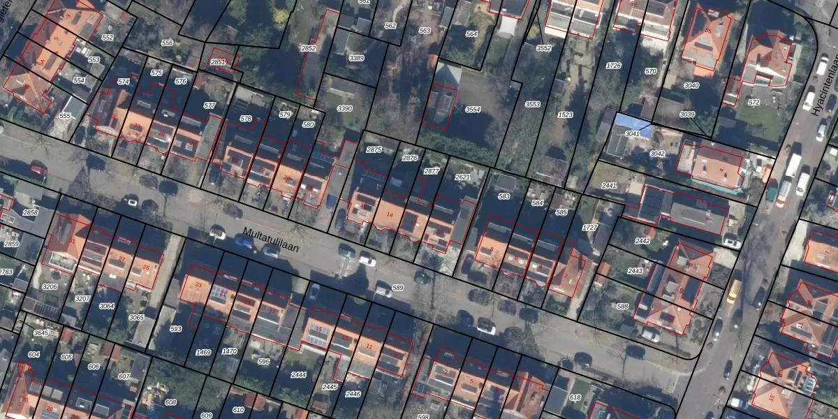 Multatulilaan 12 is gelegen op kadastraal perceel HVS00M2877. Deze kadastrale aanduiding is uniek en wordt gebruikt door het Kadaster om eigendomsrechten en andere zakelijke rechten vast te leggen. Het perceel maakt onderdeel uit van de kadastrale gemeente Hilversum.