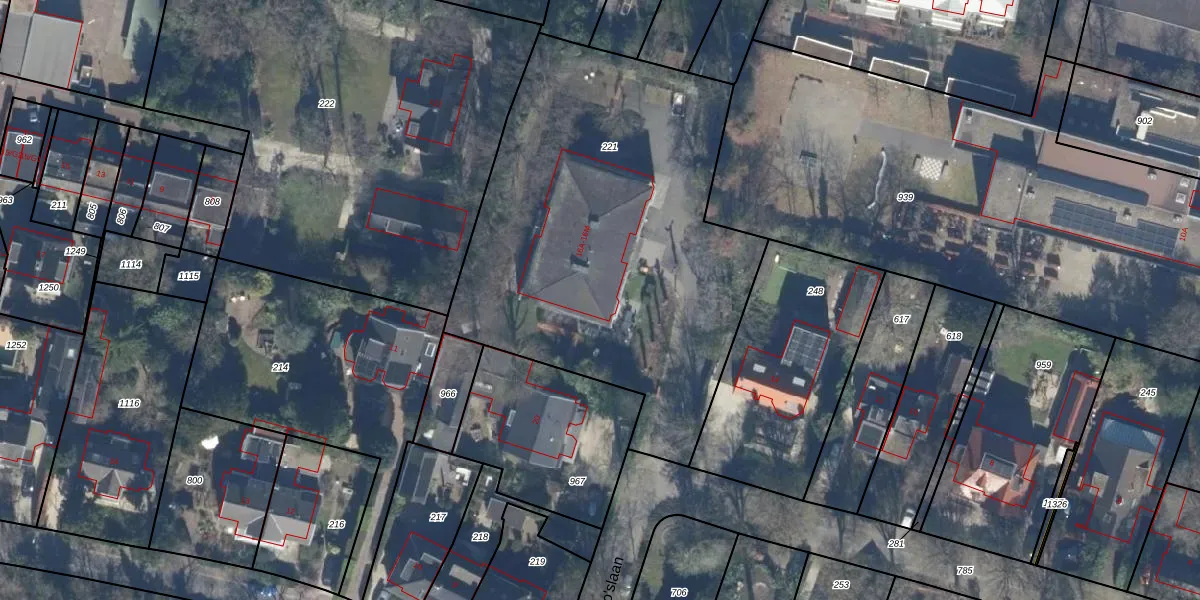 Het adres is gelegen op perceel 221 in de sectie P en de kadastrale gemeente Hilversum. De kadastrale aanduiding is aldus HVS00-P-221. Het perceel is met 2332 m² relatief groot. Het gemiddelde ligt in de kadastrale gemeente Hilversum op 1394,51 m². Het grootste perceel in de kadastrale gemeente is 91,7 ha. Het kleinste perceel heeft een oppervlakte van 0 m². Er zijn 12 adressen aanwezig op het perceel. De huidige grenzen van het perceel zijn digitaal in de Basisregistratie Kadaster (BRK) geregistreerd op 26-05-1999.