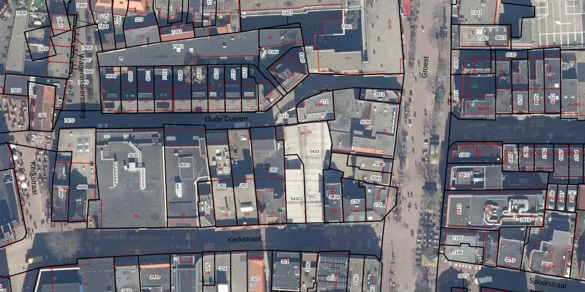 Het perceel waarop Oude Doelen 5-B staat heeft een oppervlakte van 349 m². Dit is een groot perceel. De perceeloppervlakte wordt geregistreerd door het Kadaster. Gedetailleerde informatie over de maten van dit perceel kunt u vinden in het rapport Kadastrale kaart met maatvoering van Oude Doelen 5-B.