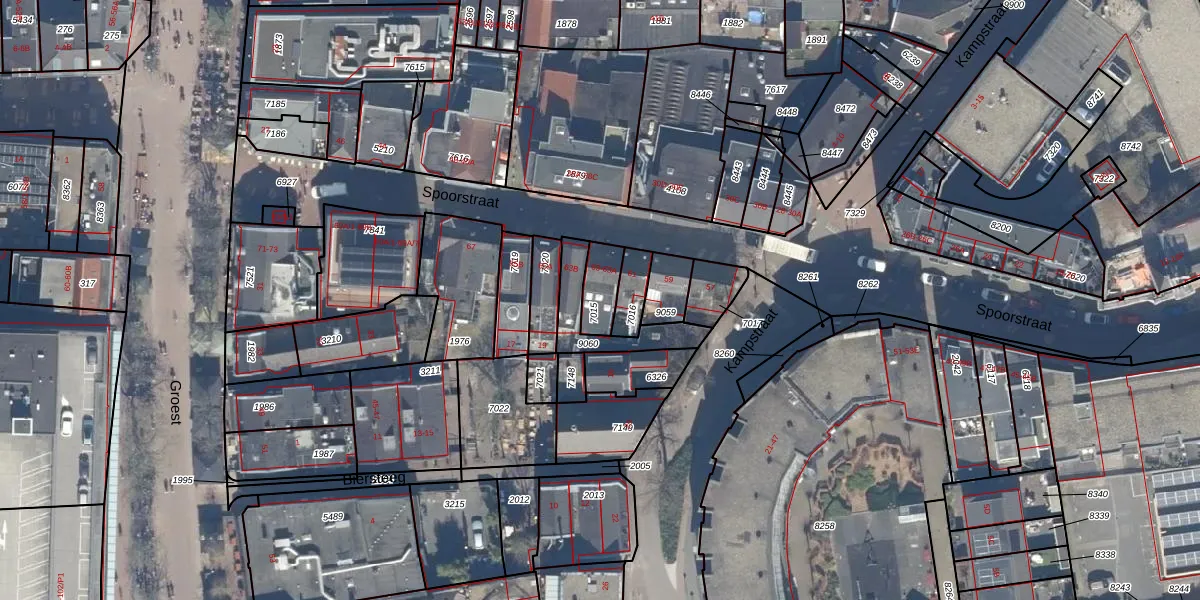 Het perceel waarop Spoorstraat 63-A staat heeft een oppervlakte van 80 m². Dit is een klein perceel. De perceeloppervlakte wordt geregistreerd door het Kadaster. Gedetailleerde informatie over de maten van dit perceel kunt u vinden in het rapport Kadastrale kaart met maatvoering van Spoorstraat 63-A.