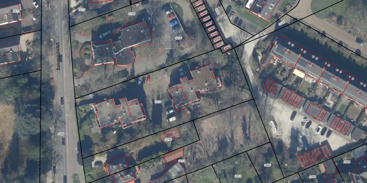 Het perceel waarop Utrechtseweg 13-22 staat heeft een oppervlakte van 3013 m². Dit is een zeer groot perceel. De perceeloppervlakte wordt geregistreerd door het Kadaster. Gedetailleerde informatie over de maten van dit perceel kunt u vinden in het rapport Kadastrale kaart met maatvoering van Utrechtseweg 13-22.