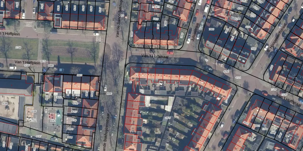 Het perceel waarop Van 't Hoffstraat 6 staat heeft een oppervlakte van 4115 m². Dit is een zeer groot perceel. De perceeloppervlakte wordt geregistreerd door het Kadaster. Gedetailleerde informatie over de maten van dit perceel kunt u vinden in het rapport Kadastrale kaart met maatvoering van Van 't Hoffstraat 6.