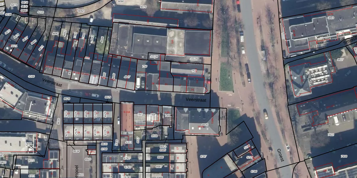 Het perceel waarop Veerstraat 2 staat heeft een oppervlakte van 355 m². Dit is een groot perceel. De perceeloppervlakte wordt geregistreerd door het Kadaster. Gedetailleerde informatie over de maten van dit perceel kunt u vinden in het rapport Kadastrale kaart met maatvoering van Veerstraat 2.