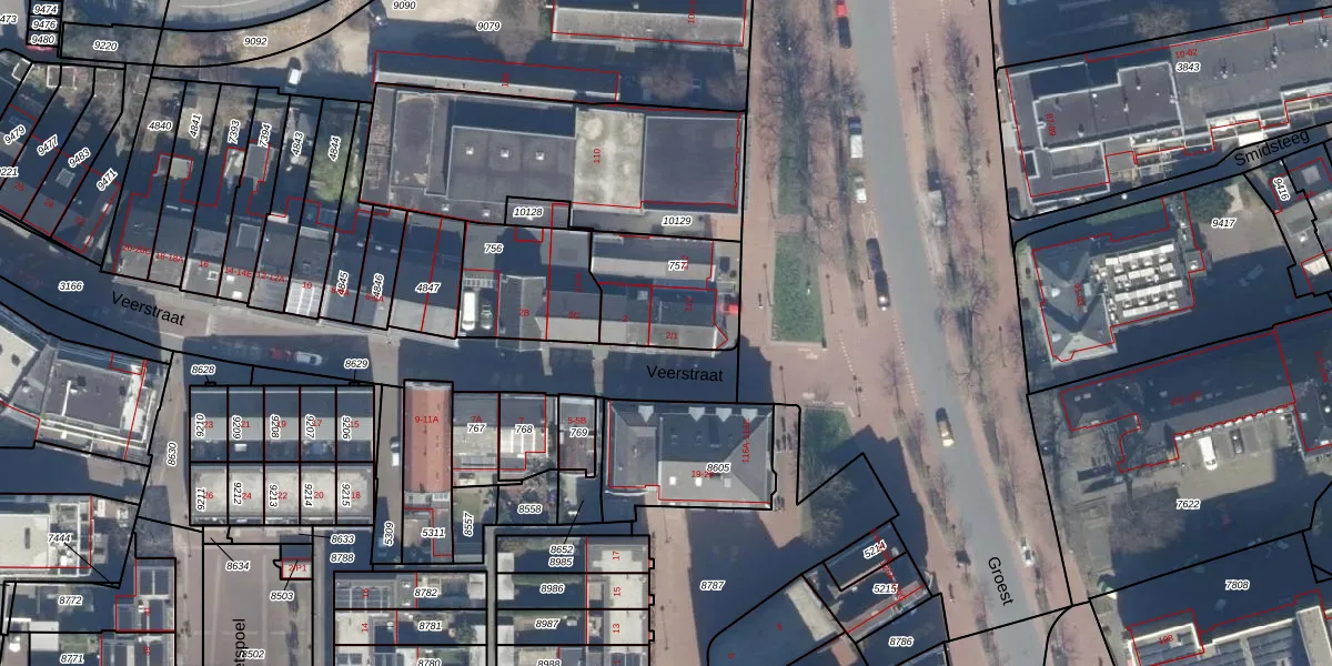 Het perceel waarop Veerstraat 2-1 staat heeft een oppervlakte van 355 m². Dit is een groot perceel. De perceeloppervlakte wordt geregistreerd door het Kadaster. Gedetailleerde informatie over de maten van dit perceel kunt u vinden in het rapport Kadastrale kaart met maatvoering van Veerstraat 2-1.