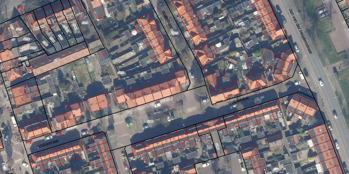 Voltastraat 103 is gelegen op kadastraal perceel HVS00R1272. Deze kadastrale aanduiding is uniek en wordt gebruikt door het Kadaster om eigendomsrechten en andere zakelijke rechten vast te leggen. Het perceel maakt onderdeel uit van de kadastrale gemeente Hilversum.