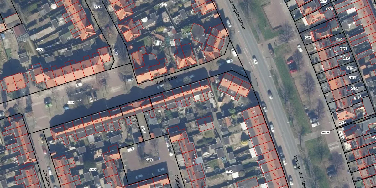 Het perceel waarop Voltastraat 56 staat heeft een oppervlakte van 5740 m². Dit is een zeer groot perceel. De perceeloppervlakte wordt geregistreerd door het Kadaster. Gedetailleerde informatie over de maten van dit perceel kunt u vinden in het rapport Kadastrale kaart met maatvoering van Voltastraat 56.