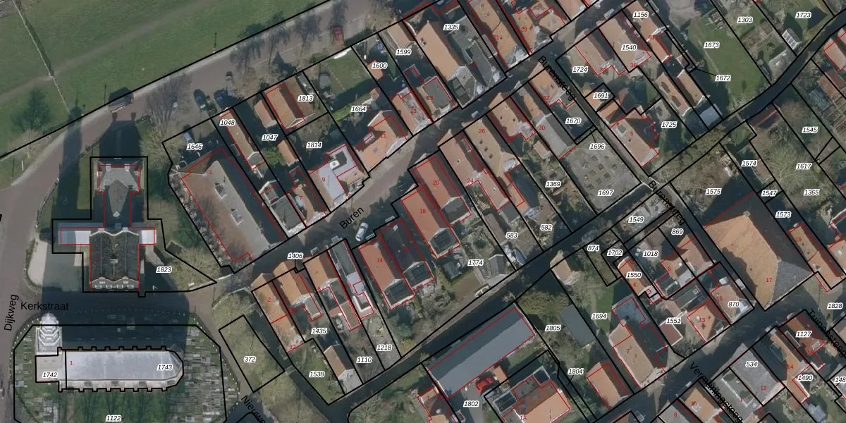 Het perceel waarop Buren 18 staat heeft een oppervlakte van 935 m². Dit is een groot perceel. De perceeloppervlakte wordt geregistreerd door het Kadaster. Gedetailleerde informatie over de maten van dit perceel kunt u vinden in het rapport Kadastrale kaart met maatvoering van Buren 18.