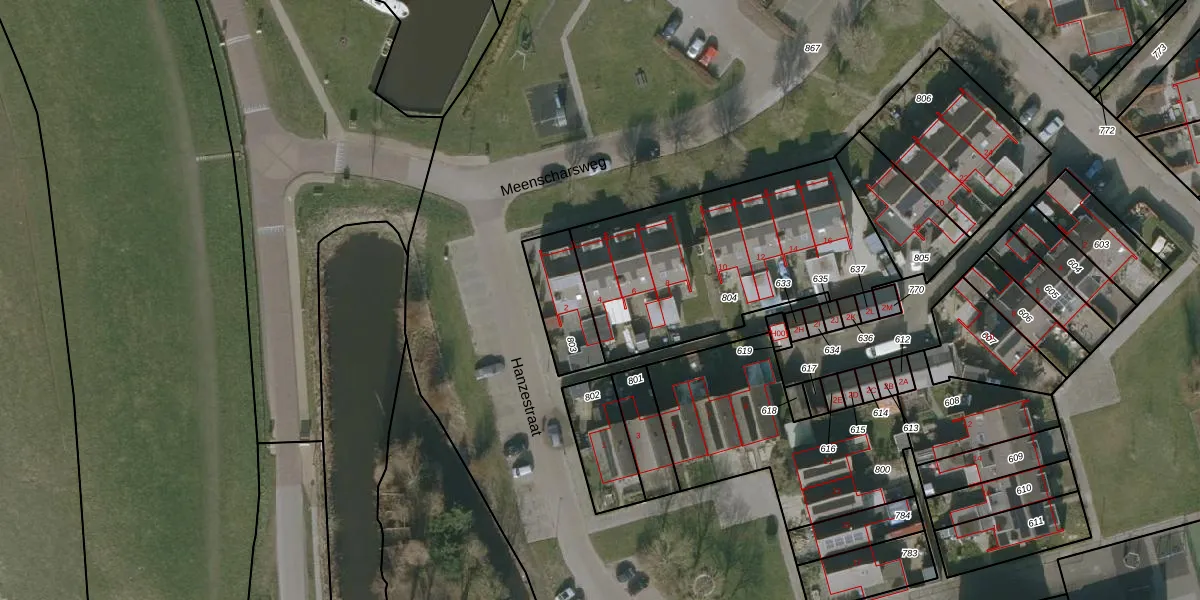Het perceel waarop Meenscharsweg 4 staat heeft een oppervlakte van 1097 m². Dit is een zeer groot perceel. De perceeloppervlakte wordt geregistreerd door het Kadaster. Gedetailleerde informatie over de maten van dit perceel kunt u vinden in het rapport Kadastrale kaart met maatvoering van Meenscharsweg 4.