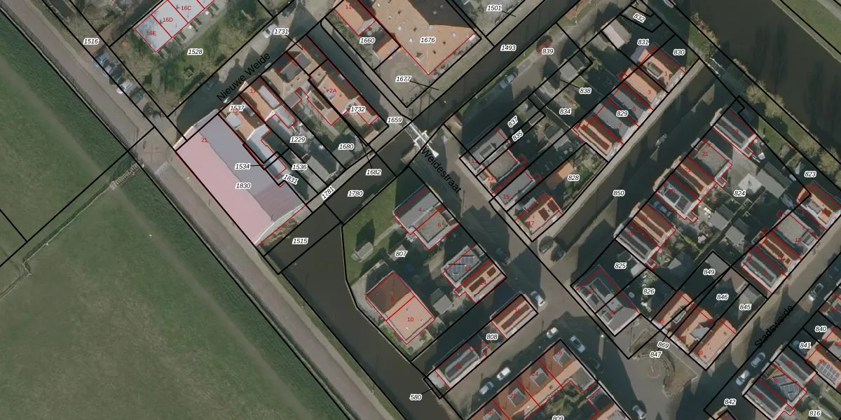Het perceel waarop Weidestraat 4 staat heeft een oppervlakte van 1020 m². Dit is een zeer groot perceel. De perceeloppervlakte wordt geregistreerd door het Kadaster. Gedetailleerde informatie over de maten van dit perceel kunt u vinden in het rapport Kadastrale kaart met maatvoering van Weidestraat 4.