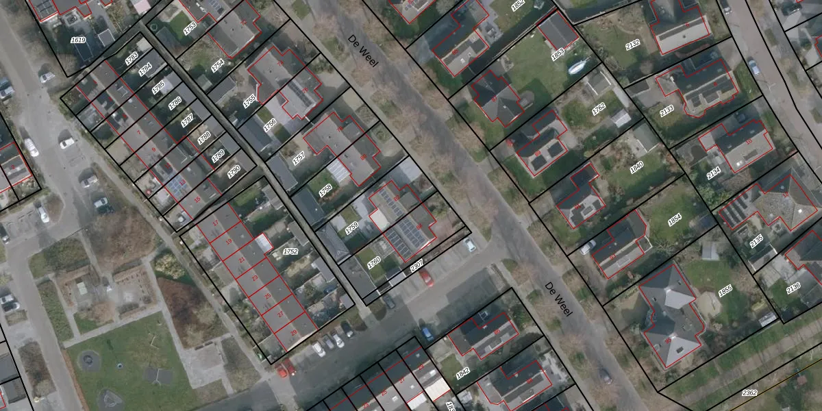 Het perceel waarop De Weel 82 staat heeft een oppervlakte van 320 m². Dit is een groot perceel. De perceeloppervlakte wordt geregistreerd door het Kadaster. Gedetailleerde informatie over de maten van dit perceel kunt u vinden in het rapport Kadastrale kaart met maatvoering van De Weel 82.