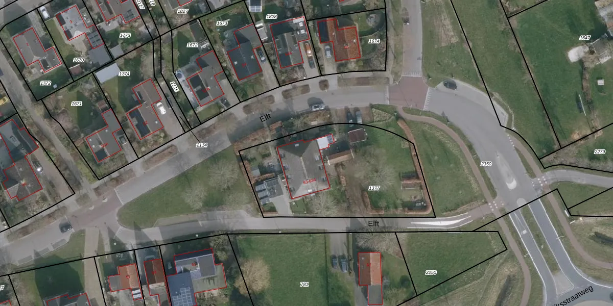 Het perceel waarop Elft 63 staat heeft een oppervlakte van 1500 m². Dit is een zeer groot perceel. De perceeloppervlakte wordt geregistreerd door het Kadaster. Gedetailleerde informatie over de maten van dit perceel kunt u vinden in het rapport Kadastrale kaart met maatvoering van Elft 63.