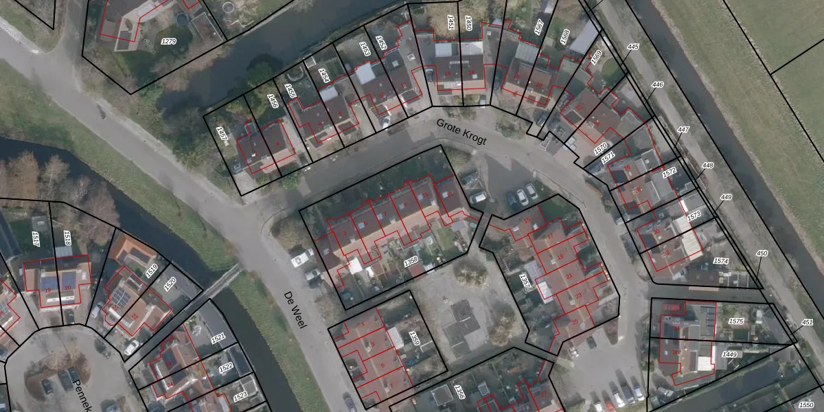 Het perceel waarop Grote Krogt 9 staat heeft een oppervlakte van 1010 m². Dit is een zeer groot perceel. De perceeloppervlakte wordt geregistreerd door het Kadaster. Gedetailleerde informatie over de maten van dit perceel kunt u vinden in het rapport Kadastrale kaart met maatvoering van Grote Krogt 9.