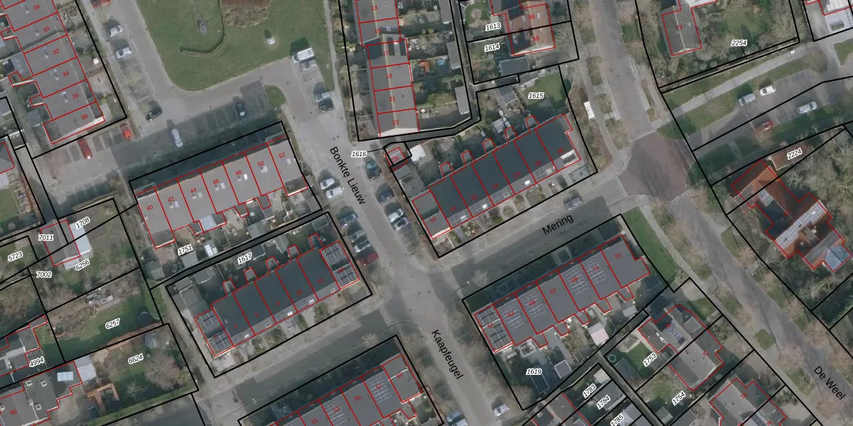 Het perceel waarop Mering 16 staat heeft een oppervlakte van 1157 m². Dit is een zeer groot perceel. De perceeloppervlakte wordt geregistreerd door het Kadaster. Gedetailleerde informatie over de maten van dit perceel kunt u vinden in het rapport Kadastrale kaart met maatvoering van Mering 16.