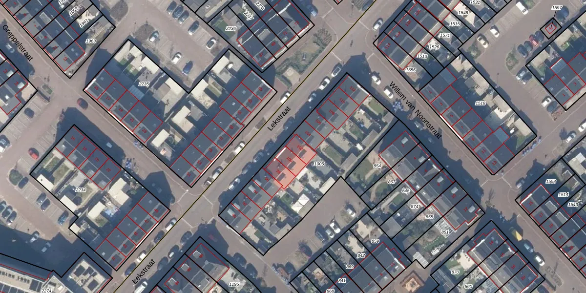 Lekstraat 102 is gelegen op kadastraal perceel VAN00F1005. Deze kadastrale aanduiding is uniek en wordt gebruikt door het Kadaster om eigendomsrechten en andere zakelijke rechten vast te leggen. Het perceel maakt onderdeel uit van de kadastrale gemeente Vianen.