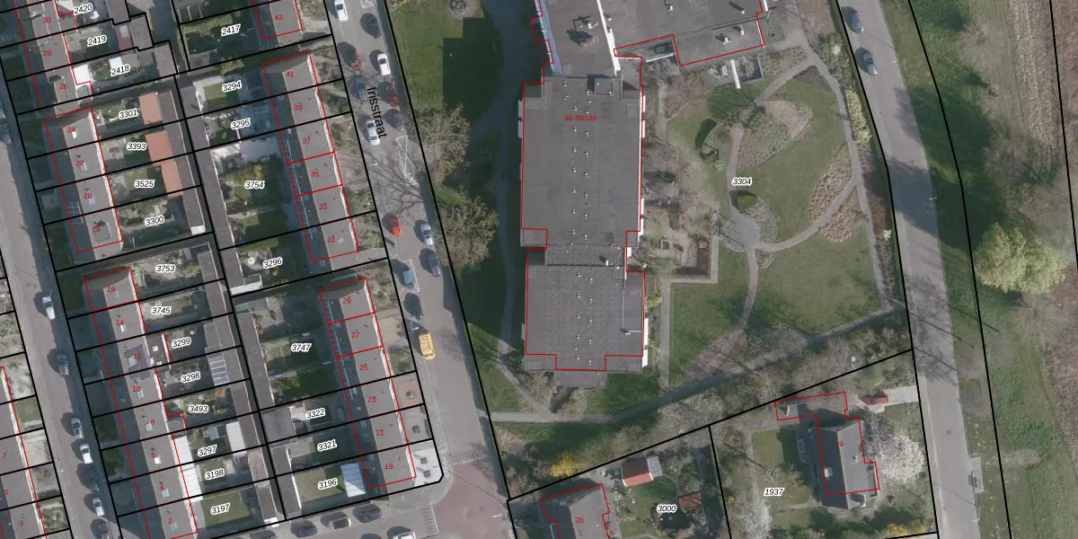Het perceel waarop Irisstraat 30-010 staat heeft een oppervlakte van 9020 m². Dit is een zeer groot perceel. De perceeloppervlakte wordt geregistreerd door het Kadaster. Gedetailleerde informatie over de maten van dit perceel kunt u vinden in het rapport Kadastrale kaart met maatvoering van Irisstraat 30-010.