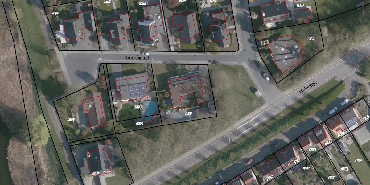 Kreeksingel 1 is gelegen op kadastraal perceel HOE02I2487. Deze kadastrale aanduiding is uniek en wordt gebruikt door het Kadaster om eigendomsrechten en andere zakelijke rechten vast te leggen. Het perceel maakt onderdeel uit van de kadastrale gemeente Hoek.