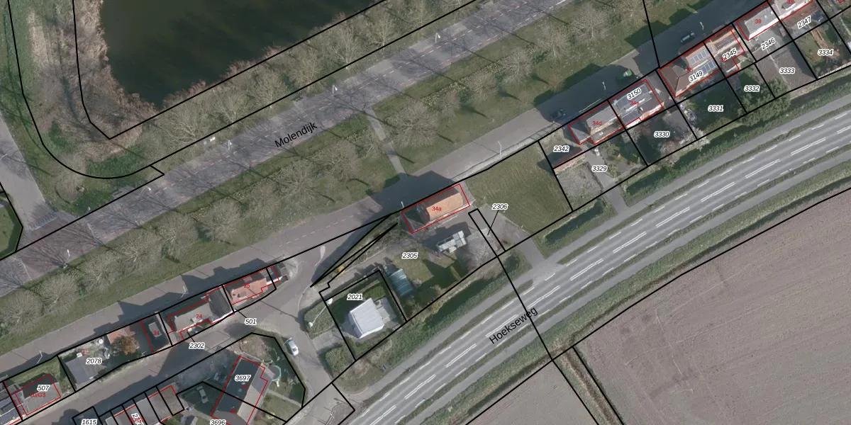 Molendijk 34-a is gelegen op kadastraal perceel HOE02I2305. Deze kadastrale aanduiding is uniek en wordt gebruikt door het Kadaster om eigendomsrechten en andere zakelijke rechten vast te leggen. Het perceel maakt onderdeel uit van de kadastrale gemeente Hoek.