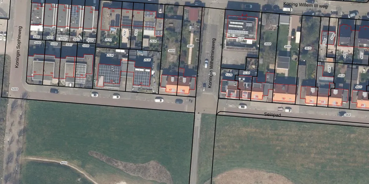 Het perceel waarop Seinpad 45 staat heeft een oppervlakte van 505 m². Dit is een groot perceel. De perceeloppervlakte wordt geregistreerd door het Kadaster. Gedetailleerde informatie over de maten van dit perceel kunt u vinden in het rapport Kadastrale kaart met maatvoering van Seinpad 45.