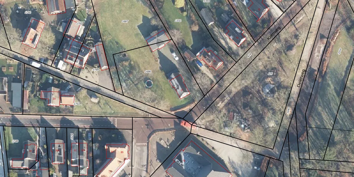 Het perceel waarop Krimweg 25 staat heeft een oppervlakte van 1425 m². Dit is een zeer groot perceel. De perceeloppervlakte wordt geregistreerd door het Kadaster. Gedetailleerde informatie over de maten van dit perceel kunt u vinden in het rapport Kadastrale kaart met maatvoering van Krimweg 25.