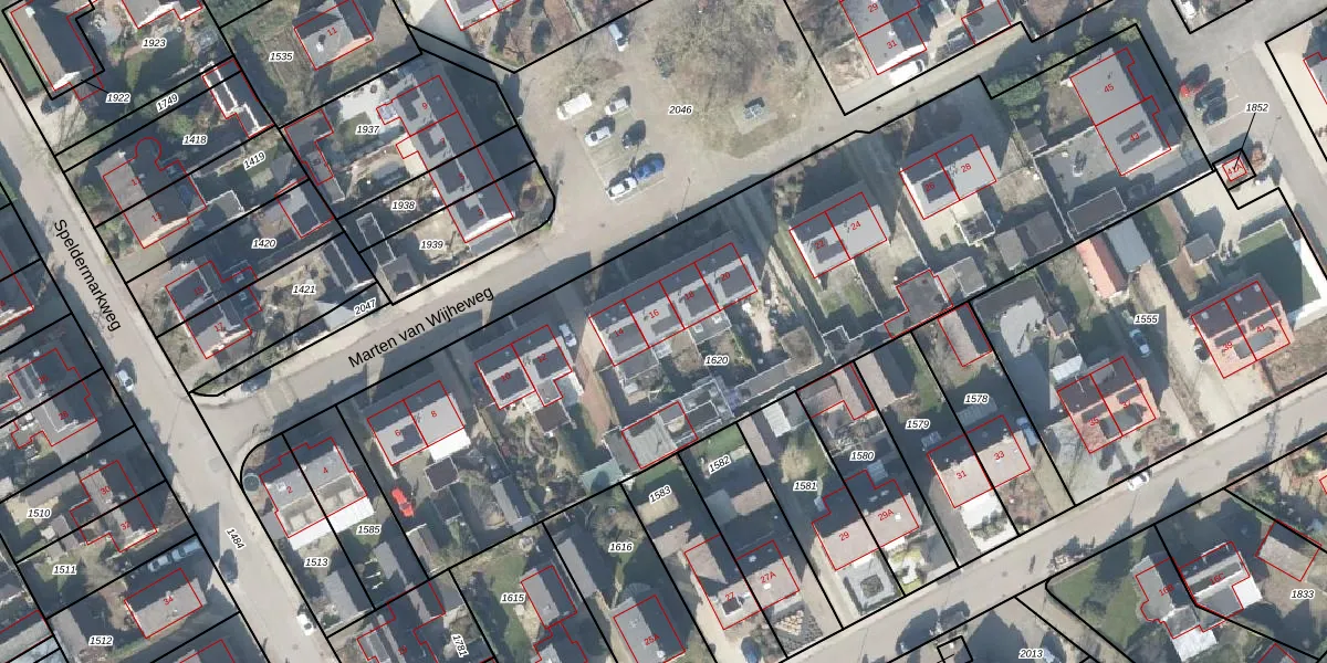 Het perceel waarop Marten van Wijheweg 16 staat heeft een oppervlakte van 3880 m². Dit is een zeer groot perceel. De perceeloppervlakte wordt geregistreerd door het Kadaster. Gedetailleerde informatie over de maten van dit perceel kunt u vinden in het rapport Kadastrale kaart met maatvoering van Marten van Wijheweg 16.