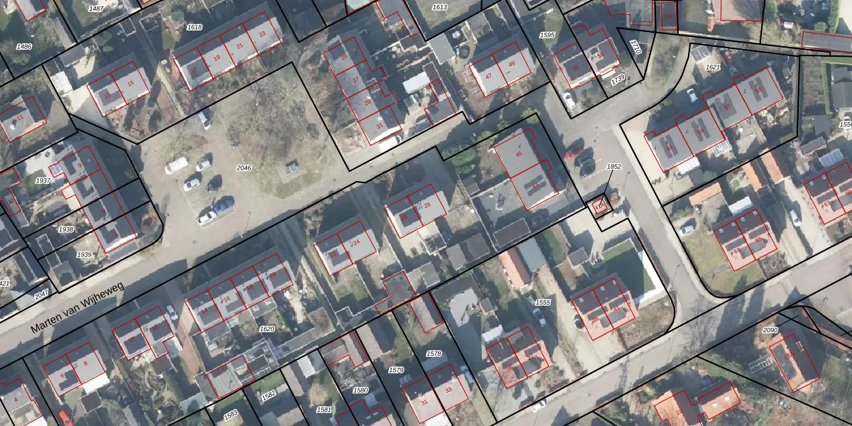 Het perceel waarop Marten van Wijheweg 28 staat heeft een oppervlakte van 3880 m². Dit is een zeer groot perceel. De perceeloppervlakte wordt geregistreerd door het Kadaster. Gedetailleerde informatie over de maten van dit perceel kunt u vinden in het rapport Kadastrale kaart met maatvoering van Marten van Wijheweg 28.