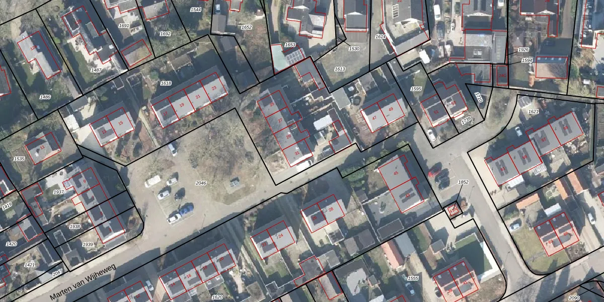 Het perceel waarop Marten van Wijheweg 31 staat heeft een oppervlakte van 2845 m². Dit is een zeer groot perceel. De perceeloppervlakte wordt geregistreerd door het Kadaster. Gedetailleerde informatie over de maten van dit perceel kunt u vinden in het rapport Kadastrale kaart met maatvoering van Marten van Wijheweg 31.